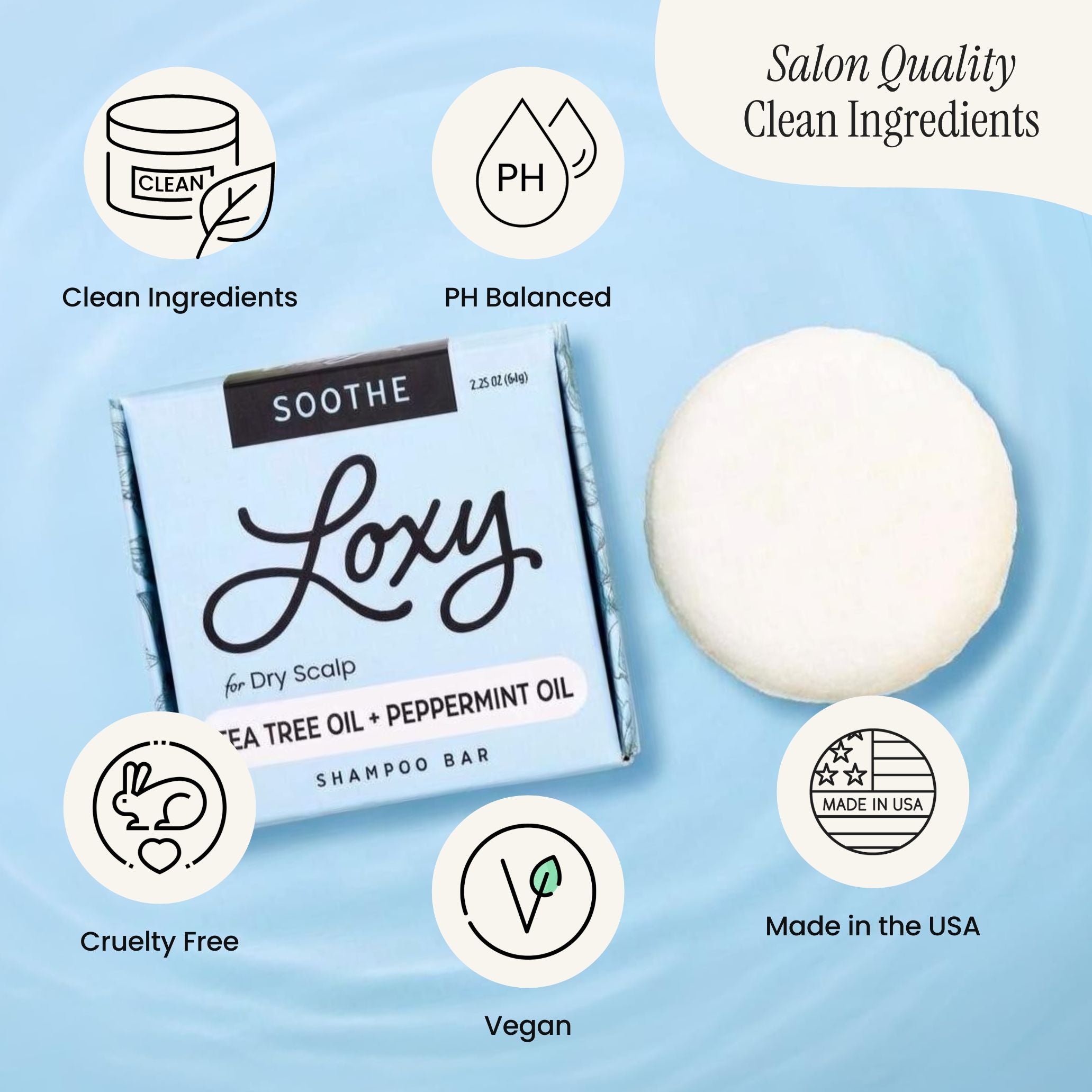 Our Loxy SOOTHE scalp calming shampoo bar helps to hydrate dry or itchy scalps. Perfect for helping to reduce flakes and irritation or just to help strengthen hair. Added peppermint oil, tea tree oil, and lime oil all work to cleanse and moisturize your scalp. Better yet it smells delicious.